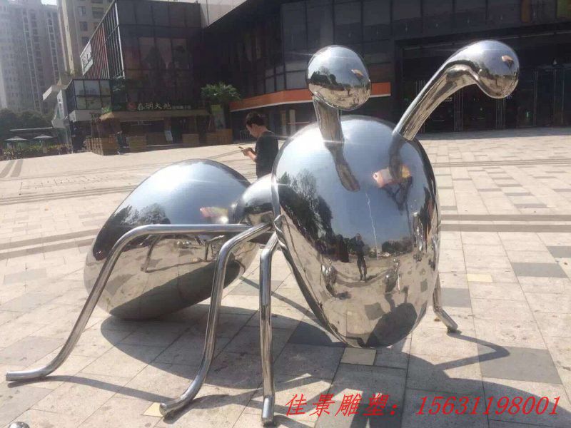 广场大型不锈钢蚂蚁雕塑可用材质不仅局限于304,还可以是201等,所使用的工艺也不只是烤漆,还可以是喷镀、喷漆、拉丝、镜面等,尺寸和适用场所也非固定不变,具体请电话咨询15631198001。