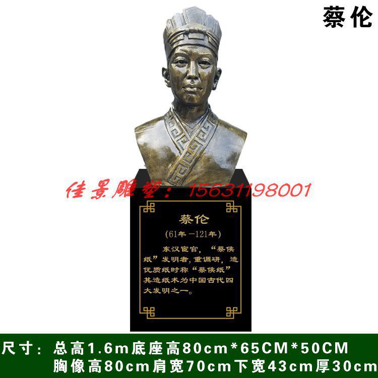 校园古代名人蔡伦头像铜雕可用材质不仅局限于黄铜,还可以是青铜、紫铜等,所使用的工艺也不只是铸造,还可以是着色、鎏金、贴金、镀金等,尺寸和适用场所也非固定不变,具体请电话咨询15631198001。