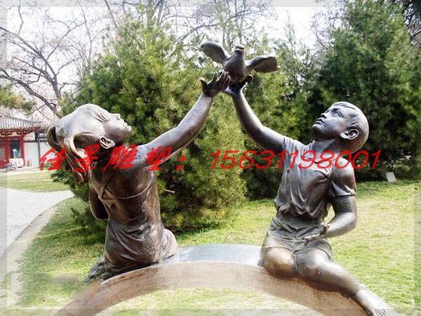 校园和平鸽儿童铜雕可用材质不仅局限于黄铜,还可以是青铜、紫铜等,所使用的工艺也不只是铸造,还可以是着色、鎏金、贴金、镀金等,尺寸和适用场所也非固定不变,具体请电话咨询15631198001。