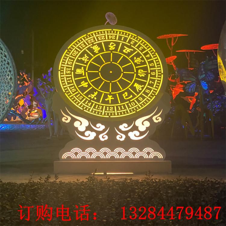 不锈钢雕塑日晷晷面两面都有刻度,分子、丑、寅、卯、辰、巳、午、未、申、酉、戌、亥十二时辰,每个时辰又等分为时初、时正,这正是一日24小时。 绝大部分的日晷显示的都是视太阳时,有些在设计上作了变更,可以显示标准时或是日光节约时间。