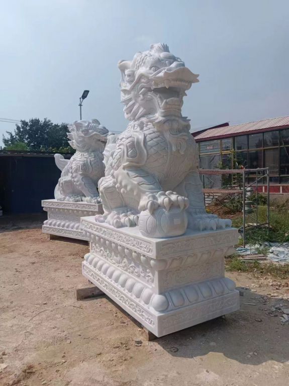 汉白玉麒麟是一种以汉白玉为材质雕刻而成的瑞兽雕塑。汉白玉是一种晶莹洁白的大理石,质地细腻,光泽温润,非常适合用于雕刻精美的艺术品。麒麟作为中国传统文化中的祥瑞之兽,具有深厚的文化内涵。